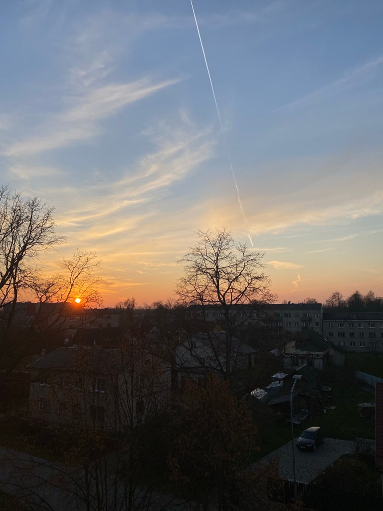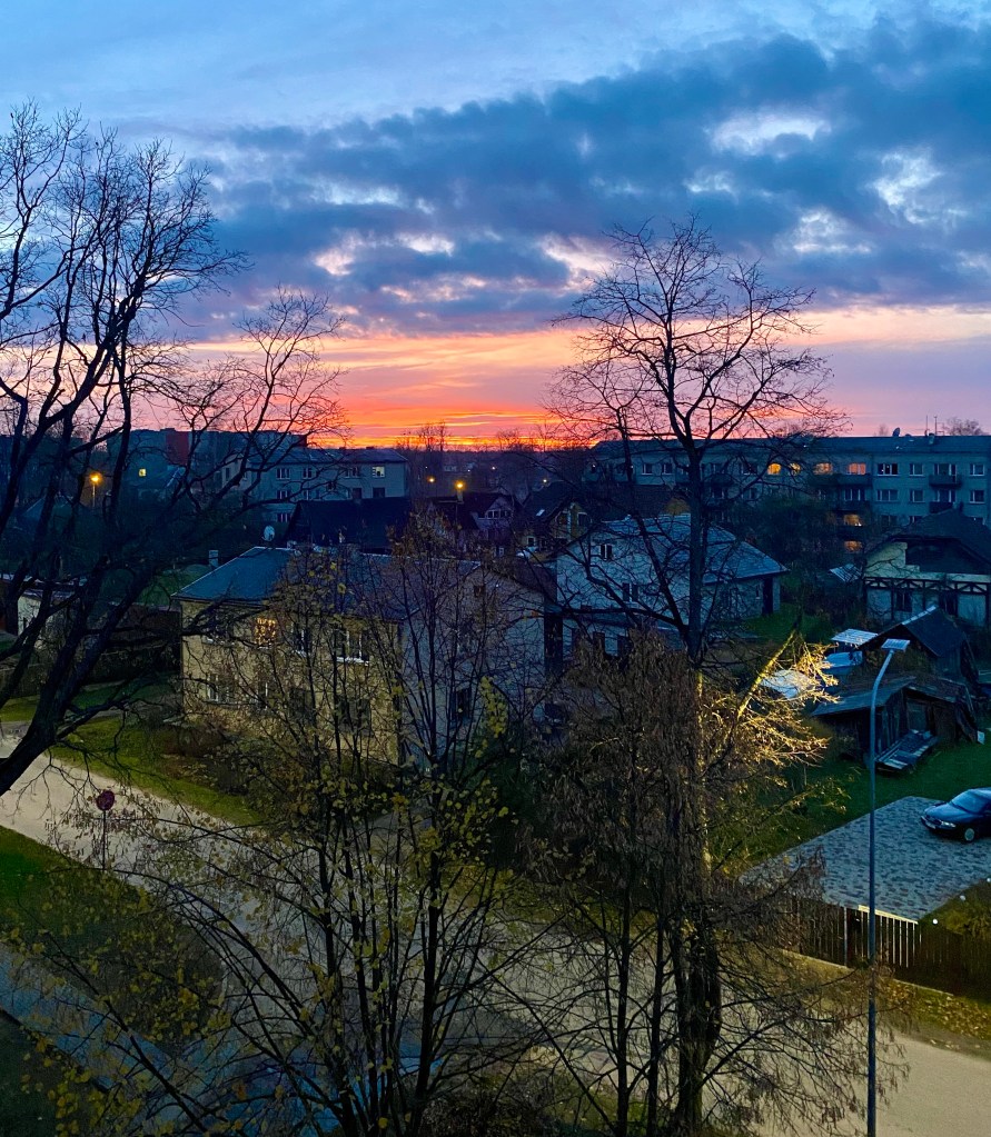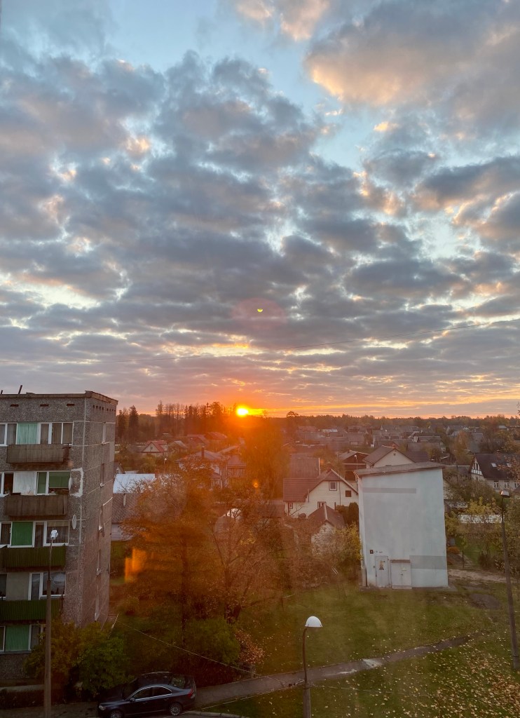 Lena had to wait a few days to start at school though, because her on-arrival training started right away on Monday, making her staying at the flat for 3 days. With good hopes and energy, we went to school together on Thursday, only to be stuck at home again on Friday. Because guess what, some of the kids were contact persons to somebody with COVID. Which meant we had to quarantine, for at least a week. On top of that, the Latvian government also decided we were going into a lockdown, since the numbers were rising pretty fast. Good thing we were prepared, because Aija had made sure we had enough food in the flat for months. So with a full fridge and freezer, we installed ourselves in the living room with some unwatched series and movies, and enough to talk about and get to know each other. Of course we went on daily walks to get some fresh air and to show Lena how pretty Preiļi is. And I mean, we were bored. Like, no energy to do anything bored. But we’ve managed, by doing jigsaw puzzles, well, Lena did most of it, listening to music, watch some sports games and loads of Netflix and chocolate. And while we still have some sun hours left, the orange sunsets we get are a treat for the eyes after the screen time.