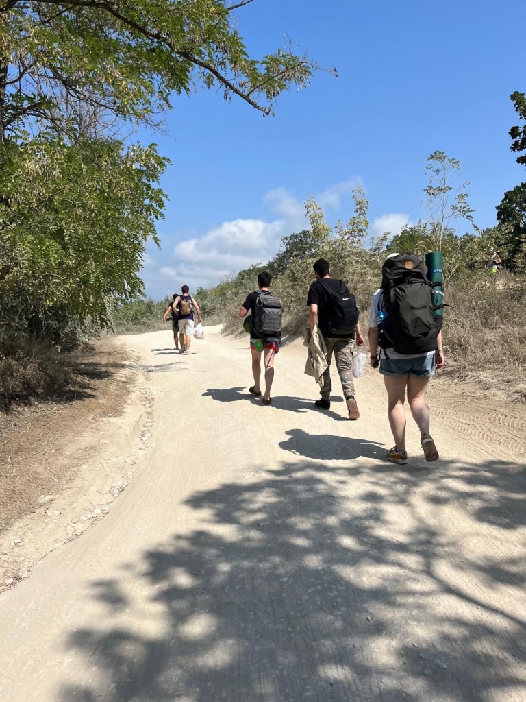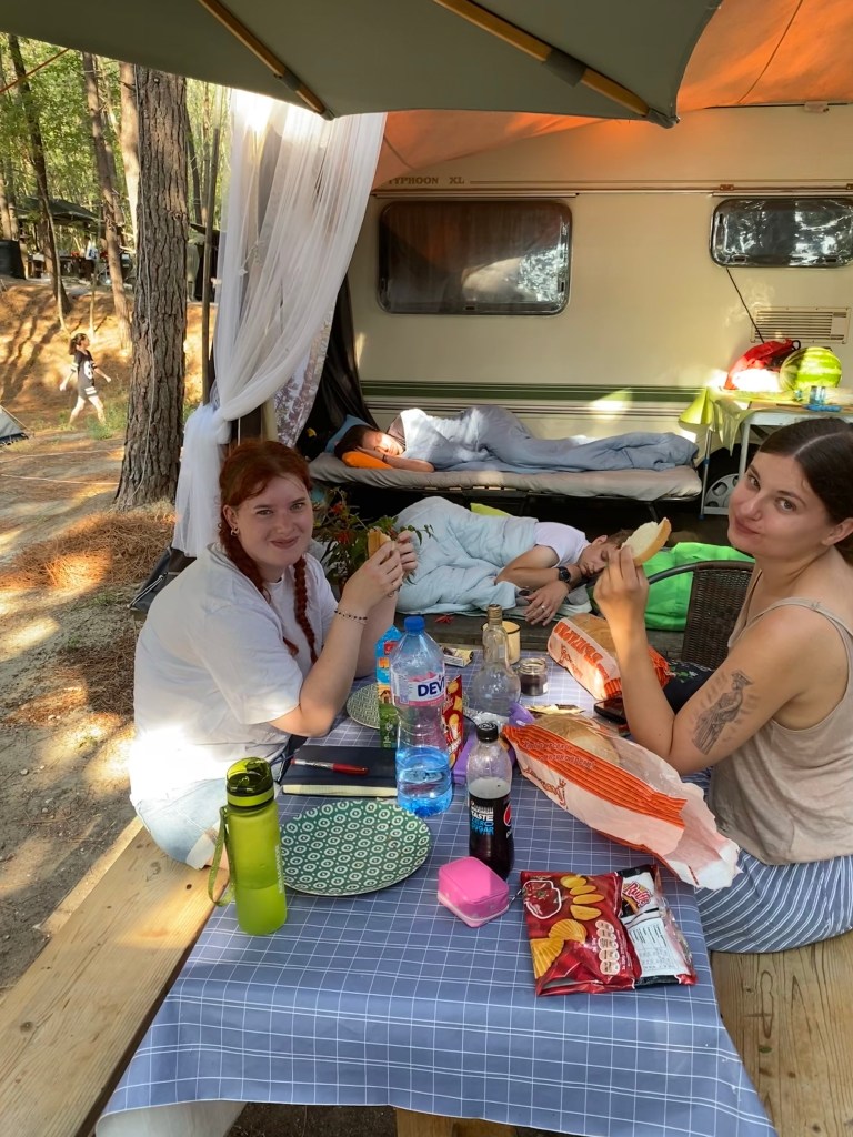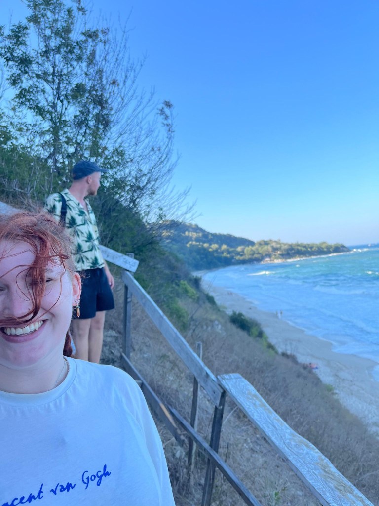 We packed our backs again in the morning and headed to the archeological museum of Varna, where we met the other guys as well. All of us traveled together to our next sleeping spot, a campsite just outside of the city. It took us a while to get on the right bus, but once we got on, we could finally relax a bit. The organisation of the reservations for the campsite went a bit hectic, for the six of us rented a caravan with an empty spot for a tent, and the other guys rented two set up tents and also an empty spot. We didn’t bring our own tent, for we were planning on sharing one with the other guys, but we did bring some mats and sleeping bags. It worked out fine for us in the end, the big bed in the caravan was big enough for three people and there was a single bed inside, a bed outside on the porch, and with our brought mats, we could sleep on the porch and in a hammock. Camping adventure for real. Once again, we changed into our bathing suits and climbed down to the beach. The waves were pretty big and intense, but actually quite fun. We had to be careful though, and once you were in the sea, there would be sand everywhere. We just chilled there for a few hours, and when it was getting dark, we made our way back up for a freezing cold shower and some more hanging out before bed.