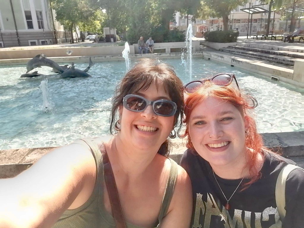 When our tour was finished, Monika, one of our trainers in Sofia and our contact person here in Targovishte, gave us an assignment to go on a treasure hunt. We were divided in three teams, and had until dinner at 20:30 to finish our tasks. All the teams had different tasks, so that we could not cheat or follow each other. I was in a team with Kate and Wael, a guy from Tunisia, and we had decided to go home first for some lunch and some rest, to explore the city when the heat would turn down a little. So, we agreed to meet at 16:00 in the center. Since Kate and I share the flat, it was easy for us to communicate, but Wael lived quite a bit outside of the center, but close by the train station, where one of our tasks took place. We had to make a picture of the time table of the train to Varna. So in our minds, it was easiest for Wael to there, take said picture, and meet us in the center, since it would take us 30 minutes by foot to get there. But when Wael was on his way, Monika texted him to meet her at the police station to get him registered. Which meant we lost our teammate. But, with one man down, we were determined to get our assignment done the best we could. We went outside and headed in the direction of the city center, when I noticed a car with a Dutch license plate. I had seen some before here, and was actually surprised by it. But not letting this opportunity slip away, we quickly walked after the car, and luckily it stopped just outside our flat. I walked up to the people who were getting out of the car, and kinda awkwardly asked them if they were Dutch and if they could help us. The guy didn’t speak that much Dutch, his wife did a bit more, but was getting her kids, since they were fluent. Yay for us. We explained to the daughter what we were doing and if she could give us directions of where to go, when the dad offered to take us with his car. Not wanting to decline this, we stepped in the car, together with a random dude, and a 6 year old girl between us in the back seat. With the slightly different driving style than either of us was used to, they drove us, in hindsight, the completely wrong way. We passed by all our stops, which we noticed and told the guy to drop us off where we wanted, but instead he dropped us of on the other side of the center. Thanking him kindly, we started making our way back, and after asking some local teenagers (they do speak English) where to go, we found our first stop, the dolphins in the fountain in the middle of the center. Looking for some more teenagers to help us out, we found two girls, and asked them to take us to the next one, a big flower/grass monument with the motto of Targovishte. Expecting to just get the directions from them, they offered to lead us there instead. So, the four of us, again awkwardly, walked there and took a picture with all of us as prove. Not really knowing our next step, Kate and I opted for a cold drink and a new plan. Another one of our tasks was to get information about an local Olympian who won a silver medal in 10m woman air shooting. So we asked the girls in the cafe about it and they provided us with the right answer. We were not allowed to use our phone for anything, not for a map or to use the internet, but had to connect with the locals instead. And it obviously worked, they were really helpful and curious! Waiting for Wael in this little cafe, Kate took the challenge to learn the Cyrillic alphabet, and when Wael arrived, but without the picture of the time table, I saw Rad walking by and ran outside to grab him so he could help us out. He was meeting with his friends, but they were so kind to help us with the rest of our tasks. So without the time table, we had finished our assignment and could show all the pictures we made to our fellow volunteers at dinner.