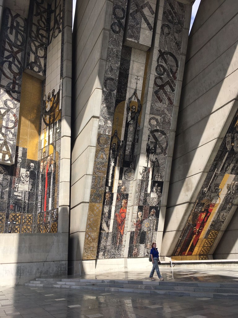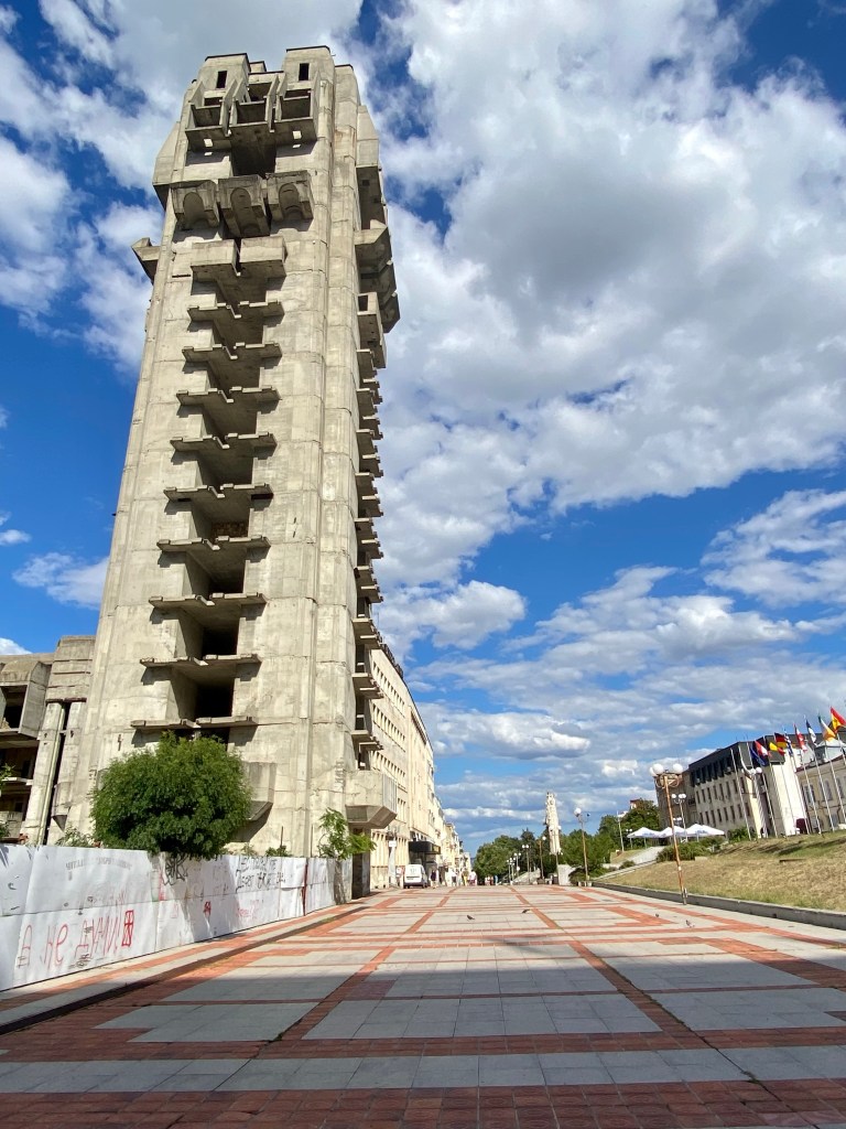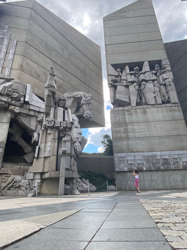 When we got home, Andrey and I had plans to go to Shumen in the afternoon. The others didn’t want to join or were too tired, so the two of us took the bus. We wanted to see the big monument on a plateau above the city, the Monument to 1300 Years of Bulgaria, or the Founders of the Bulgarian State Monument, to commemorate the 1300th anniversary of the First Bulgarian Empire. Since it is located on the plateau, it is quite the climb, with a 1300 steps staircase, so we decided to take a taxi to the top, and walk those steps down. At the busstation, we were trying to figure out how to get a taxi, but the easiest way was to just walk up to one and ask if he could take us there. The first one in line was an elderly guy, and he willingly drove us to the monument. The moment we stepped in the car and I wanted to put my seatbelt on, he just motioned no no no, not necessary, so I guess that is the Bulgarian way of saying he drives safely. Fingers crossed then. Because on our way up, we ran into a roadblock and he had to diverse his route. Since he was not prepared for this, we had to take a road in the opposite direction. Praying no one would drive into us, we luckily arrived whole at our destination. You can see the monument, according to Google and our little information guide, from a 30km distance, so you can imagine it is pretty big. To see it up close though, even more impressive. It was finished in 1981 and designed by Bulgarian sculptors Krum Damyanov and Ivan Slavov in a Cubist style. We just thought they looked like transformers, but were actually super impressed by the whole thing. After a walk around, we started our descent. Passing people who were on their way up, we considered ourselves lucky we opted for the taxi. We arrived in the city center, which was quite quiet, and had some interesting buildings, some just left unfinished, and made our way to the mosque. Once we got there, we made some pictures of the outside, and when we wanted to take a quick look inside, we were told we had to pay to see it all. Not in the mood for this, we went on our way back home. This time we took the train, and after a little wait, it was an easy ride back.