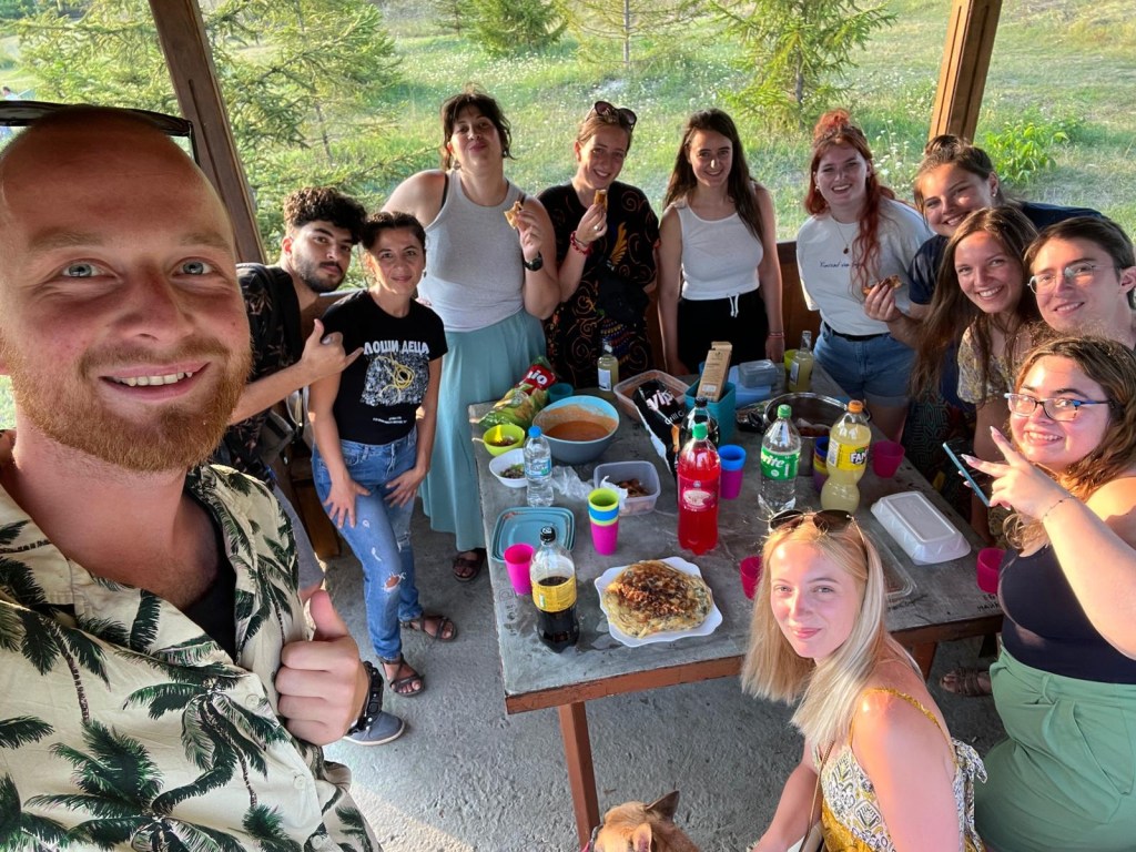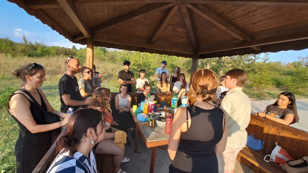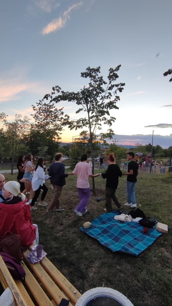 Later in the evening, all of us volunteers and some locals gathered at one of the parks for our first cultural evening. It was Bulgaria and Greece, so we had helped Kate with preparing souvlaki for 20 something people. Before we started dinner though, the Bulgarian delegation had a quiz organised for us. But then it was time for food, and everything tasted amazing, there were fresh and big tomatoes, home grown, spreads and dips, traditional banitsa, which had eggs so not for me, local cheeses and meats and more, and then of course Kate’s Greek souvlaki with tzatziki. When we all had enough to eat, it was time to dance. They all learn their traditional dances from a young age, and are more than willing to learn people who don’t know them. The day before, when we were working at Missionis, I started chatting with Rad about those dances, and he told me that there is this dance which is on a song called ‘wild roses’. So when they started dancing, I looked at him and he knew enough. Even though the first few dances were at a beginner level, this one was a bit more difficult, and I still wanted to learn. So it was just me with all the Bulgarian people, and after a few try’s, I think I got the hang of it! It was so fun to be a part of something so unfamiliar, and I felt really welcomed into their culture.